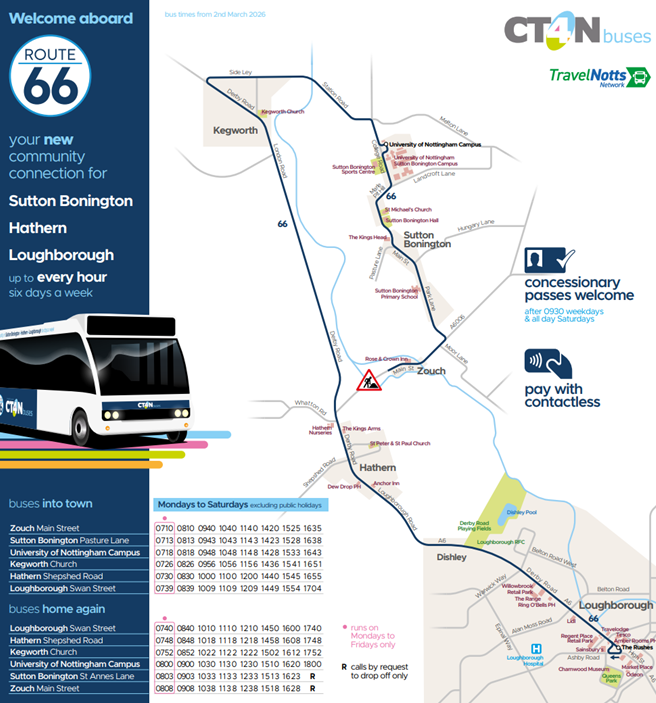 For customers travelling from Sutton Bonington, the bus will commence from Orchard Close and you will need to wait on the opposite side of the road than you currently do for journeys towards Loughborough, which will also provide access to Kegworth Village for shopping.